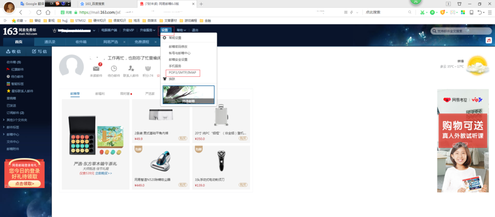 登录网页版邮箱,如图,点击【设置】选项,在下拉菜单中选择【POP3/SMTP/IMAP】,