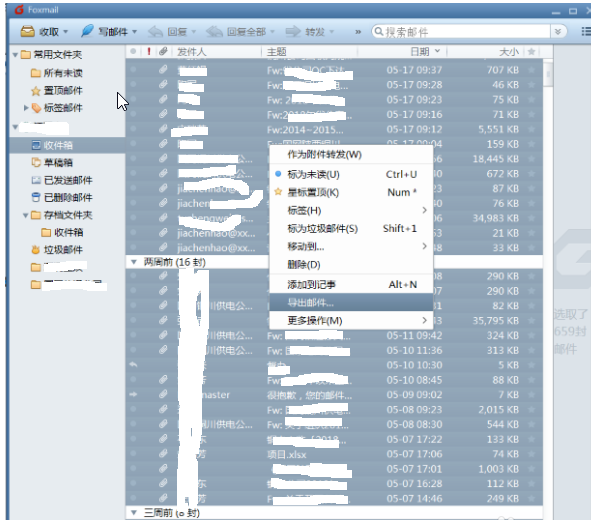 打开Foxmail,登录账号,进入界面,点击【收件箱】,选中所有邮件,鼠标右击,选中 【导出邮件】,