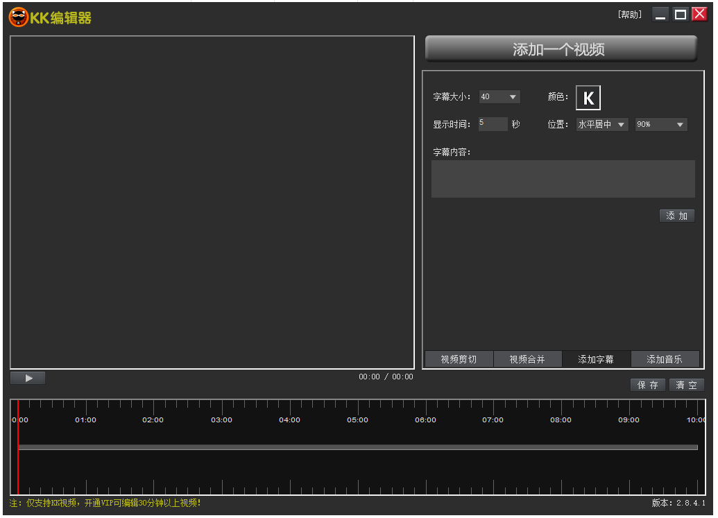 打开KK编辑器,如图,这里有【视频剪切】、【视频合并】、【添加字幕】、【添加音乐】功能,小编选择的是【添加字幕】,