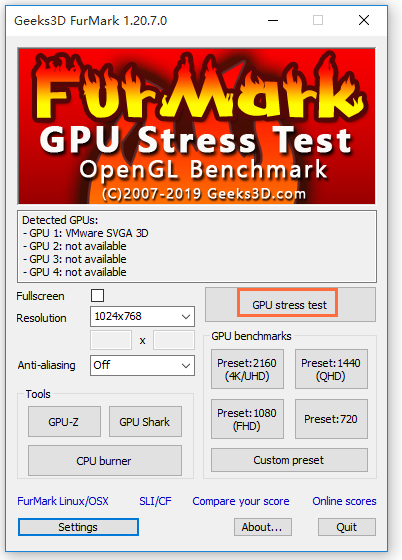 从本站下载FurMark,根据提示安装软件,运行,如图,点击【Anti-aliasing】,设置为off,关闭抗锯齿功能,