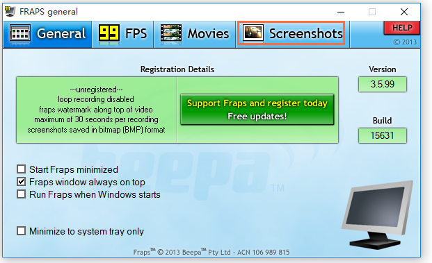 下载安装Fraps,打开软件,进入初始界面,如图,这里都是英文词汇,点击右上角的【screenshots】,即截屏功能,