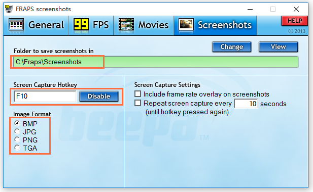 进入如下界面,在红框中可以设置截图文件保存路径,软件默认截图快捷键是F10,你可以自行修改;另外,截图文件保存格式为bmp、jpg、png和tga,