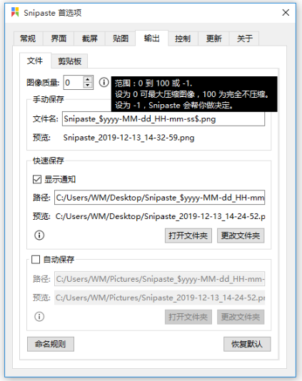 查看图像质量说明:设置为0,Snipaste可最大压缩图像,这就可能导致截图图片出现花屏现象,