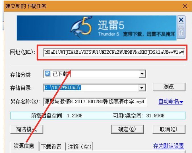 弹出对话框,建立新的下载任务,直接粘贴网址链接,设置存储目录,点击【确定】,