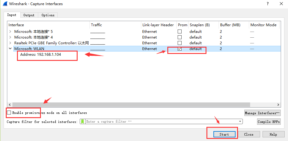 弹出窗口,如图,勾选WLAN网卡(根据各自电脑网卡使用情况进行选择),然后点击Start,开始抓包,