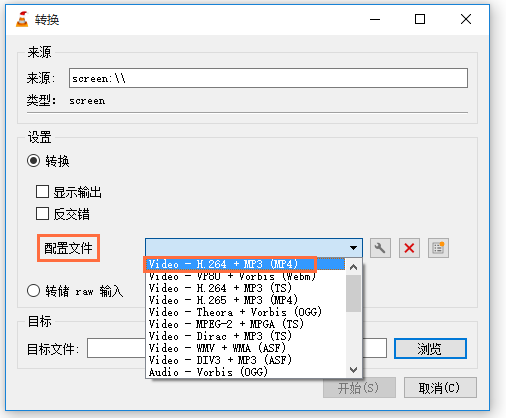 弹出转换对话框,点击【设置】——【配置文件】,选择一种保存格式,一般选H264+MP3(MP4),