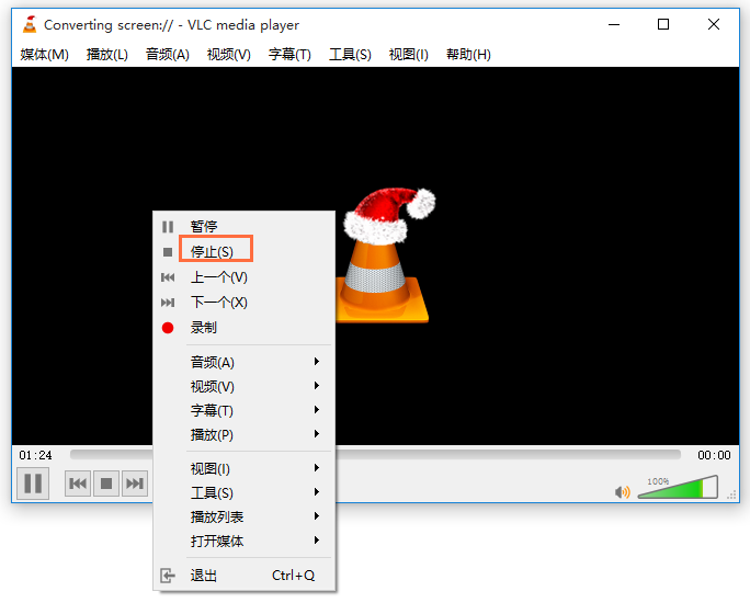 VLC Media Player开始录制视频,你可以在软件界面看到录制时间,鼠标右击界面,点击【停止】按钮,录屏结束,