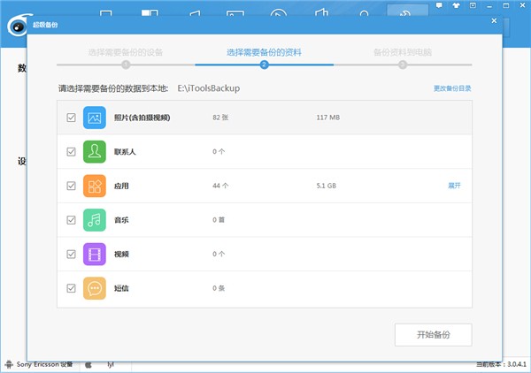 然后选择需要备份的数据和备份文件存放位置,点击【开始备份】,