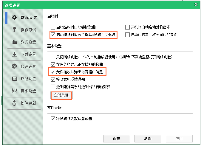 点击【设置】,弹出面板,你可以进行各种细节设置,在【常规设置】中可以关闭酷狗问候语、广告弹窗,还有【定时关机】功能,非常人性化,