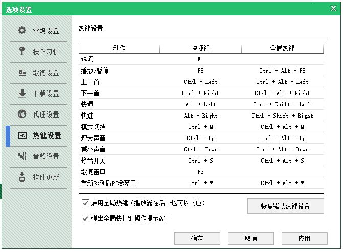选择【热键设置】,查看酷狗2012的相关快捷键,设置完成,点击【应用】——【确定】,