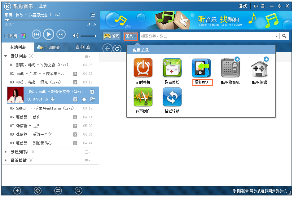 回到酷狗2012主界面,点击上方【工具】,弹出列表,选择【复制MP3】,