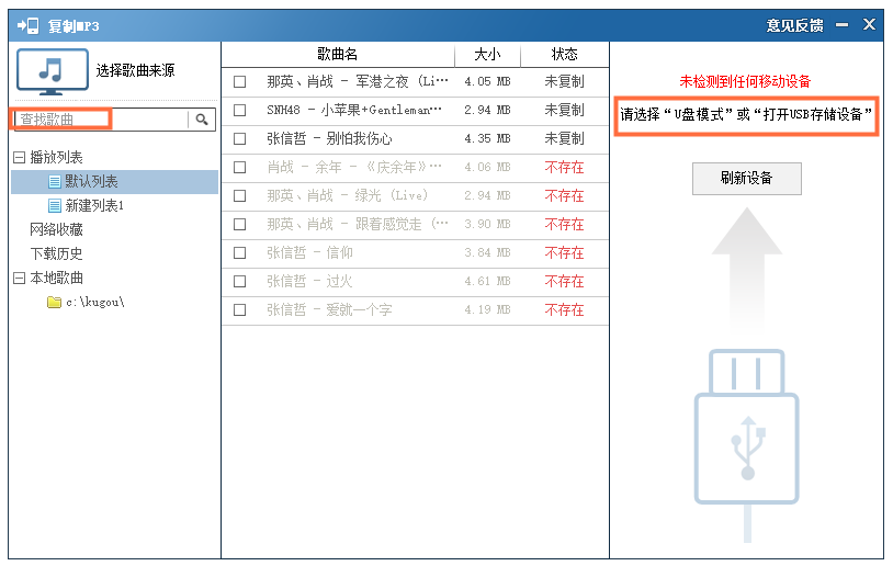 如图,将电脑与手机相连,或者在电脑中插入U盘,软件会自动识别检测,然后选择歌曲来源,可以将MP3文件导入移动设备。