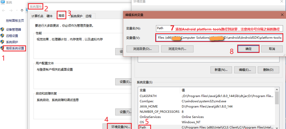 3、打开环境变量窗口,在【系统变量】中找到Path,点击【编辑】,弹出对话框,将ADB所在路径添加到Path变量值,点击确定,
