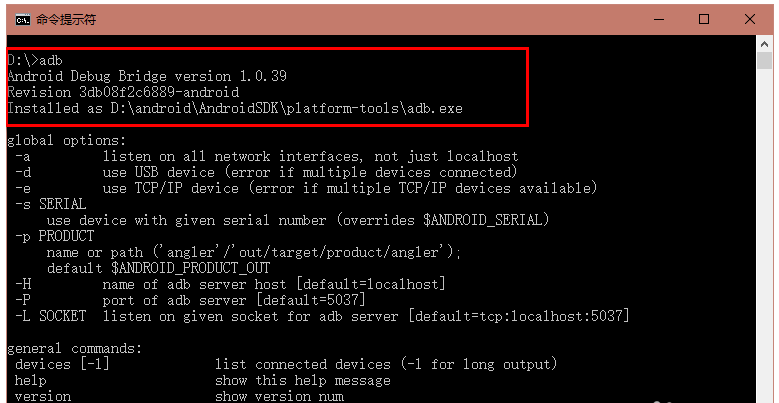 重新打开一个cmd窗口,输入ADB,回车,出现下图说明,这里有显示ADB的版本和用法,说明ADB工具安装配置完成。