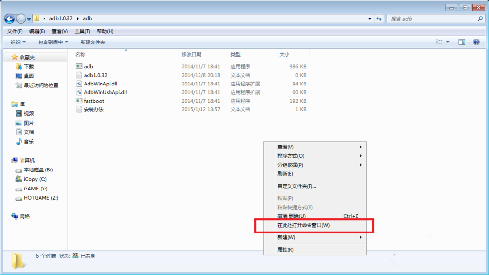 解压得到文件夹,在空白处按住shift键+鼠标右键,弹出菜单,点击【在此处打开命令窗口】,如图,