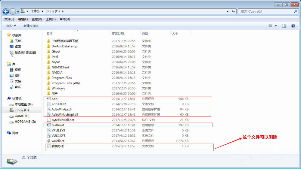 将ADB文件夹内所有文件复制到C盘根目录,然后从cmd进入C盘,即可使用文件(如果放在其他目录,路径比较复杂),
