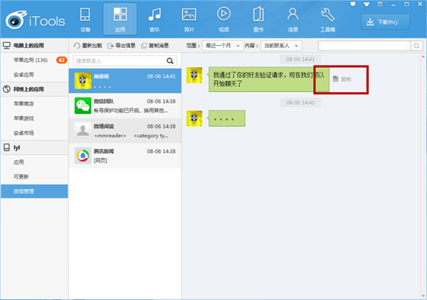 使用数据线连接手机和电脑,打开iTools软件,进入界面,软件会自动识别手机设备,然后点击【应用】——【微信管理】功能,