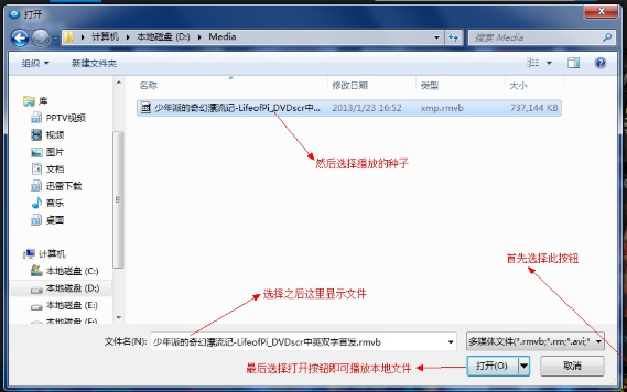 弹出对话框,找到本地视频文件,点击【打开】,即可导入视频,进行播放,