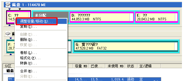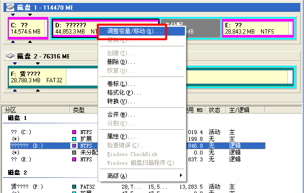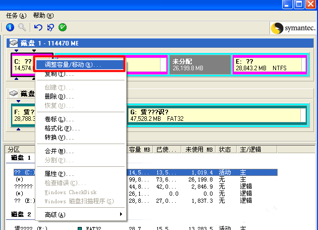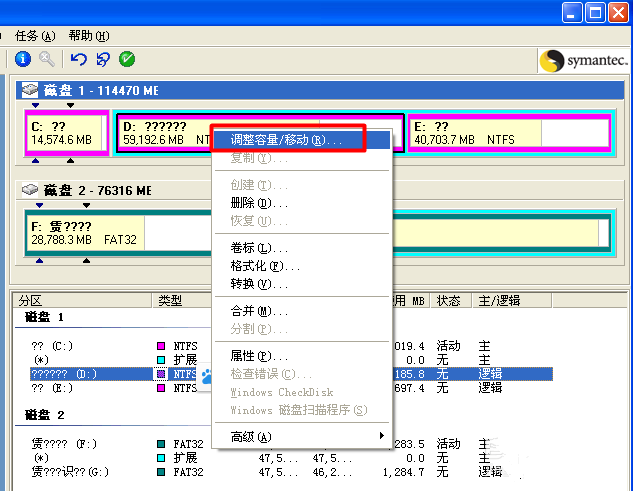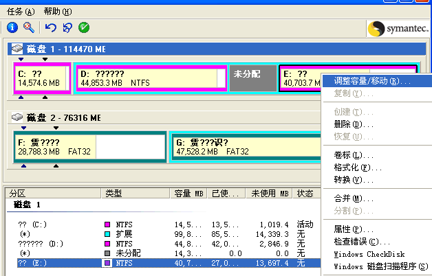 下载安装Norton PartitionMagic(硬盘分区魔术师),注意不要安装到C盘,打开软件,进入主界面,右击除C盘之外的其它拥有多余容量的盘符,弹出菜单,选择【调整容量/移动】,