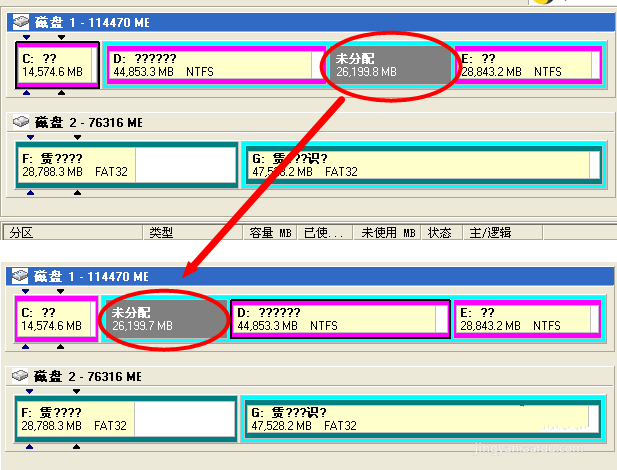 采用同样的方法,在其它硬盘中释放自由空间,需要注意的是,我们可以通过拖动“已用空间”部分来进行移动,从而将“未分配”空间进行合并,