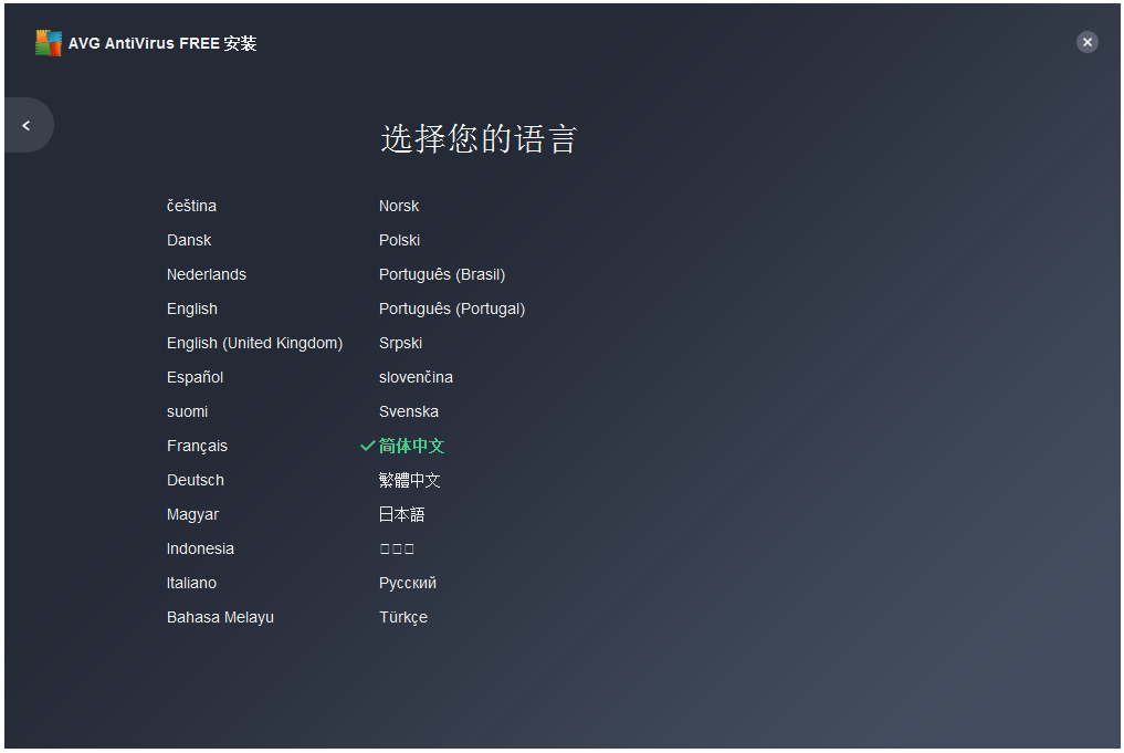从本站下载安装AVG Anti-Virus,解压压缩包,双击.exe文件,弹出界面,根据安装向导操作,选择语言,