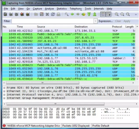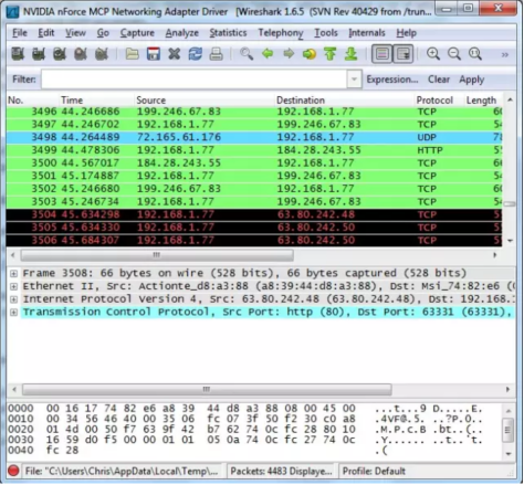 4、停止抓取后,可以看到绿、蓝、黑三种颜色的报文,绿色代表TCP报文,黑色代表有问题的TCP报文,如下图: