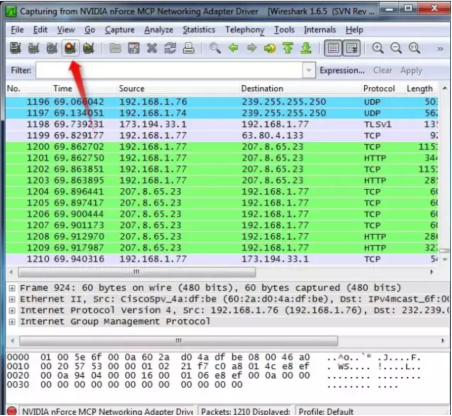 3、点击箭头所指的图标,就可以停止抓取报文,如下图: