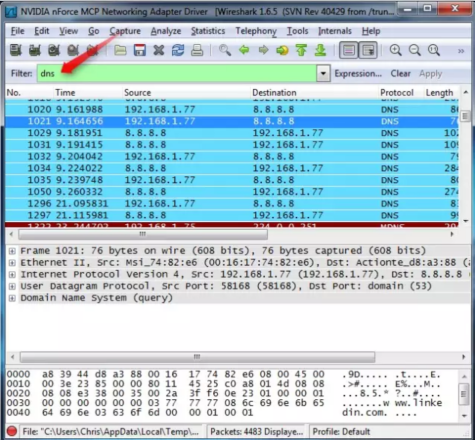 6、在软件界面箭头所指的输入栏输入“dns”,可以过滤dns文件,如下图: