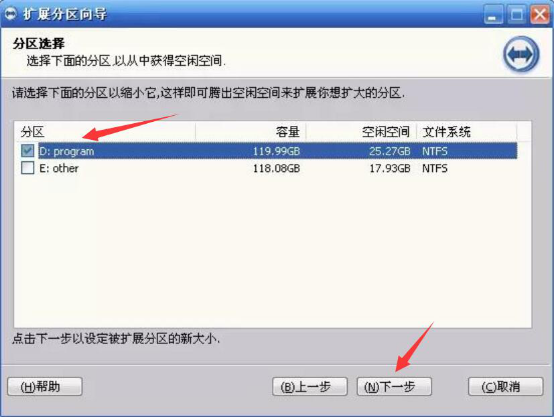 4、想让分区助手扩大C盘,那么必需借用其他盘的空间。比如选择将D盘的空间划分一部分给C盘,就可以从列表勾选D盘后点击“下一步”。