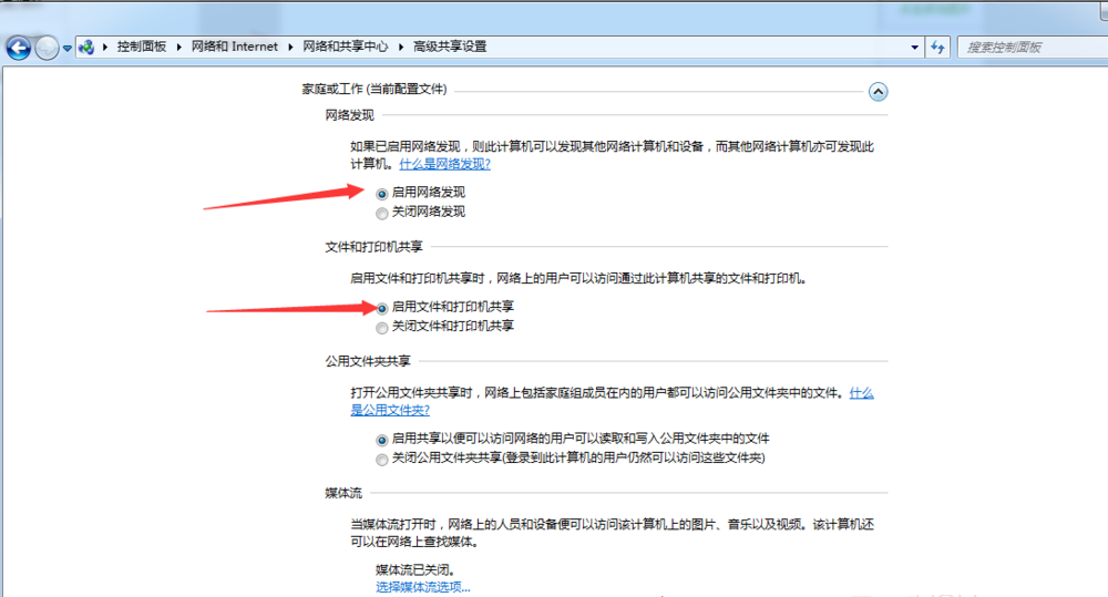 打开高级共享设置窗口,勾选【启用网络发现】和【启用文件和打印机共享】,点击保存修改。