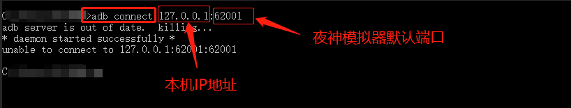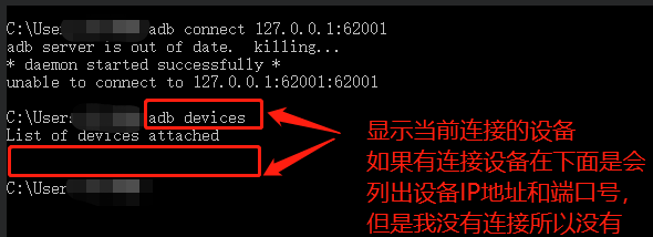 5、输入adb connect 127.0.0.1:62001,回车,显示如图,
