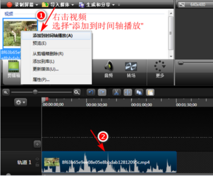 3、在弹出窗口选择视频,单击鼠标右键选择“添加到时间轴播放”,如图所示: