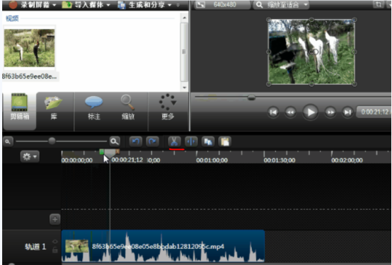 4、在弹出窗口拉动绿色拖动条,剪辑开始,拉动红色拖动条,剪辑结束,选择需要剪切的视频,点击“剪刀”(红线标注的地方),如图所示: