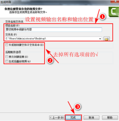 7、在弹出窗口输入项目名称、输出路径,去掉三个选项前的勾,然后点击“完成”,如图所示:
