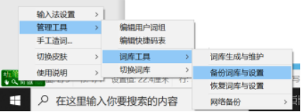 5、点击“极点五笔输入法”图标单击右键,选择“管理工具”-“词库工具”-“备份词库与设置”,如下图: