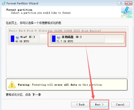 接着再按照界面提示选择要进行格式化的硬盘分区。这里,我以分区魔术师格式化D盘为例子,因为我的C盘目前还有比较多的空间。可是,你在操作的时候,直接选择C盘即可,然后同样地点击“Next”进行下一步操作。