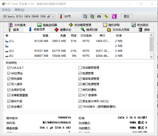 2、点击软件界面的“磁盘信息”,可以看到电脑各个磁盘的详细信息以及版本、序列号等,如下图: