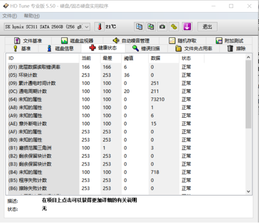 3、点击软件界面的“健康状态”,可以看到磁盘各方面的性能参数,如下图: