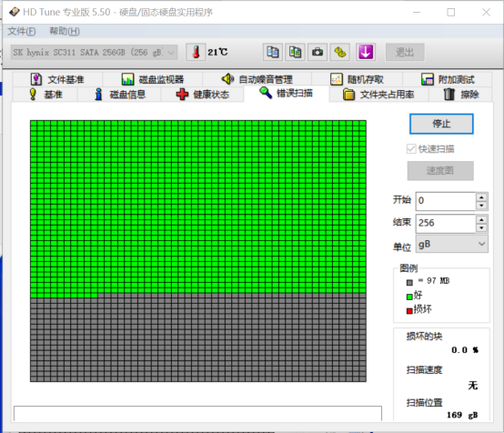 4、点击软件界面的“错误扫描”,勾选“快速扫描”,点击“开始”,扫描错误开始,点击“停止”,扫描结束,如下图: