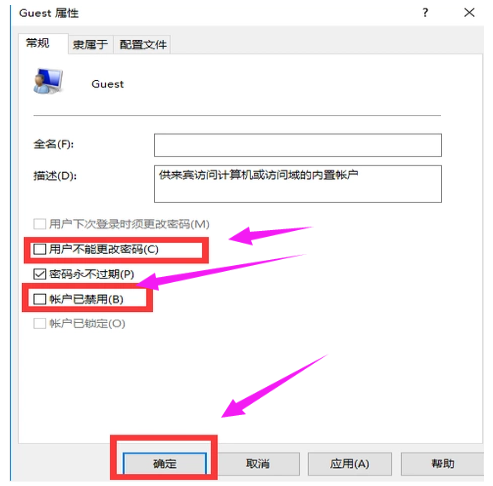 打开Guest属性面板,点击【常规】一栏,取消勾选【用户不能更改密码】和【帐户已禁用】,然后点击确定,看看问题是否解决,
