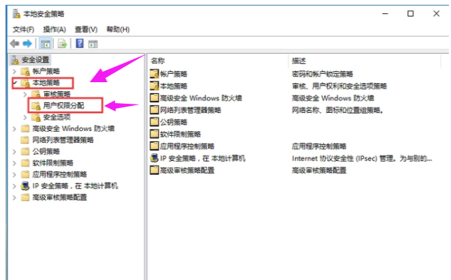 如图,在左侧点击展开【本地策略】选项,双击【用户权限分配】,