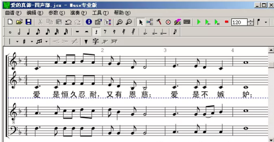在四个声部上分别操作一遍,然后修改一下Tenor和Bass声部的谱号(需要在“脚本编辑”页签中手写——其实软件可以更方便的)好啦!看看我们高大上的五线谱吧!