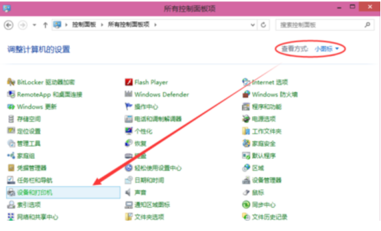2、在弹出界面选择查看方式为“小图标”,点击“设备和打印机”,如下图: