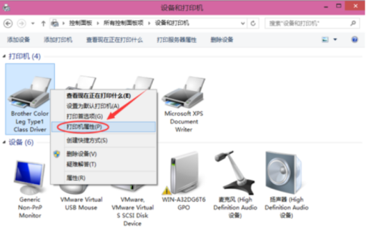 3、在弹出界面选择需要共享的打印机并单击右键选择“打印机属性”,如下图: