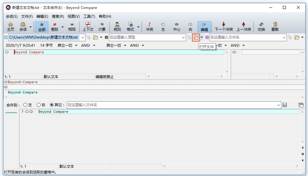 1、打开Beyond Compare,进入主页,点击【文本合并】功能,弹出对话框,如图,点击第一个【打开文件】按钮,