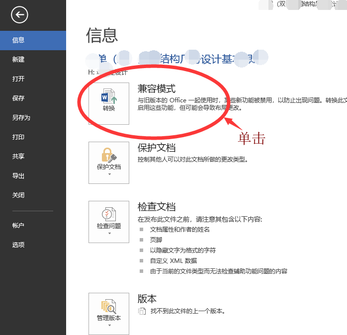 遇到这种情况,你可以先在菜单栏中点击【文件】,进入以下界面,点击【信息】,然后在右侧点击【转换】,单击文件,选择兼容模式,