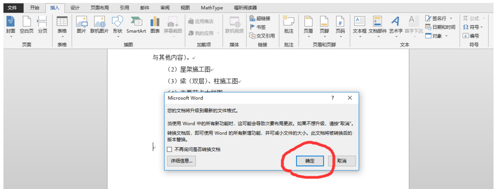 这时会弹出一个对话框,如图,提示文档将升级到最新的文件格式,一般没什么问题,点击确定即可,