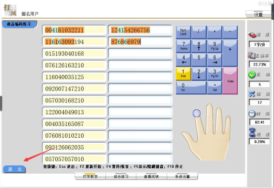 8、当用户完成该次练习或者想更改练习项目,可点击左下方的“退出”按钮,从而退出打字旋风打字练习软件的本次练习。
