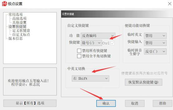 5、接着切换到极点五笔输入法的快捷键设置,用户可以设置中英文切换的按键,然后点击“确认”按钮。