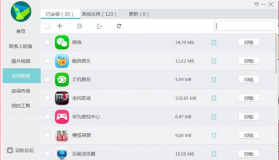 5、在软件界面点击“应用管理”,可以更新、卸载手机中的应用,如下图: